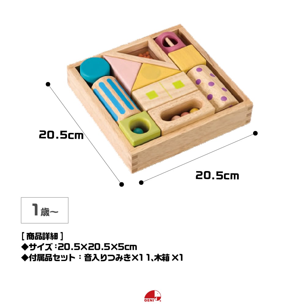 丸・三角・四角それぞれに異なる仕掛けが入っていて、中が見えるブロックでその動きを楽しむことができます。 中が見えないつみきには、どんな仕掛けが入っているか 想像する力も自然と養われます。見て楽しい、振って楽しい、積んで楽しいつみき。きれいな色と心地良い音が、情緒を豊かに育みます。つみやすい大きめのサイズでラトル代わりにもなり「初めてのつみき」としてどうぞ。 ■対象年齢:1歳~ ■安全性:ヨーロッパの安全基準(CE)、日本玩具協会の定める安全基準(ST)食品衛生法の着色料溶出検査をクリアした塗料使用。 ■サイズ: W4.5×D4.5×H4.5cm(最小立方体つみき) W20.5×D20.5×H5cm(木箱) ■付属品セット:音入りつみき×11 木箱×1